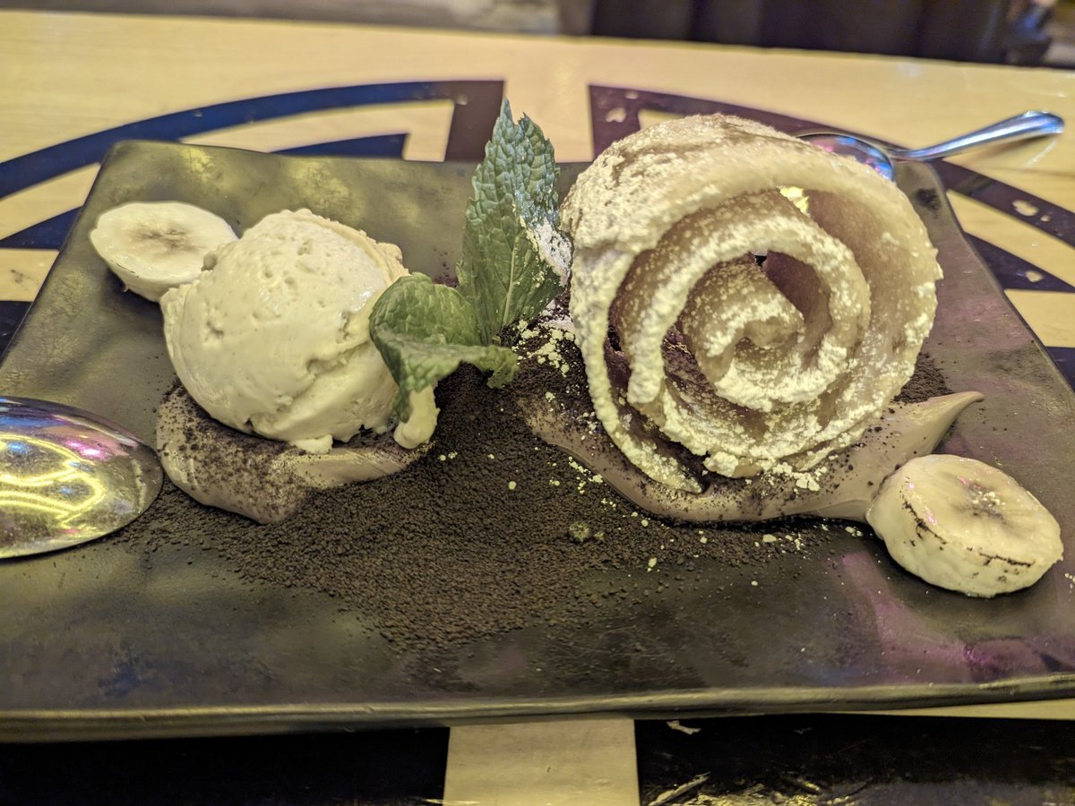Dessert was a churro like dough but crispier with chocolate cream and powder with a banana ice cream which was pretty decent. Lighting was very yellow and dim so none of the food pics gave great color balance
