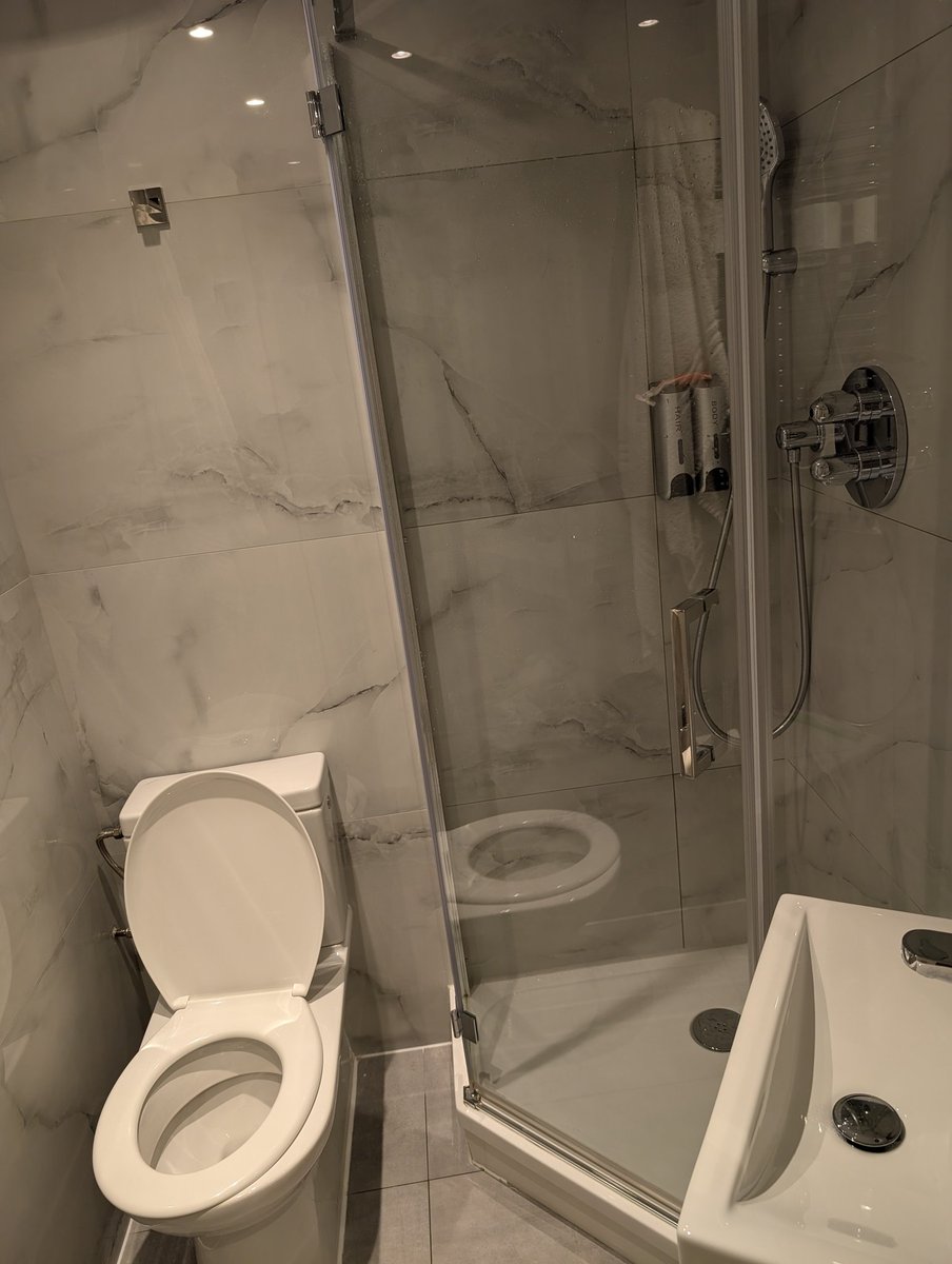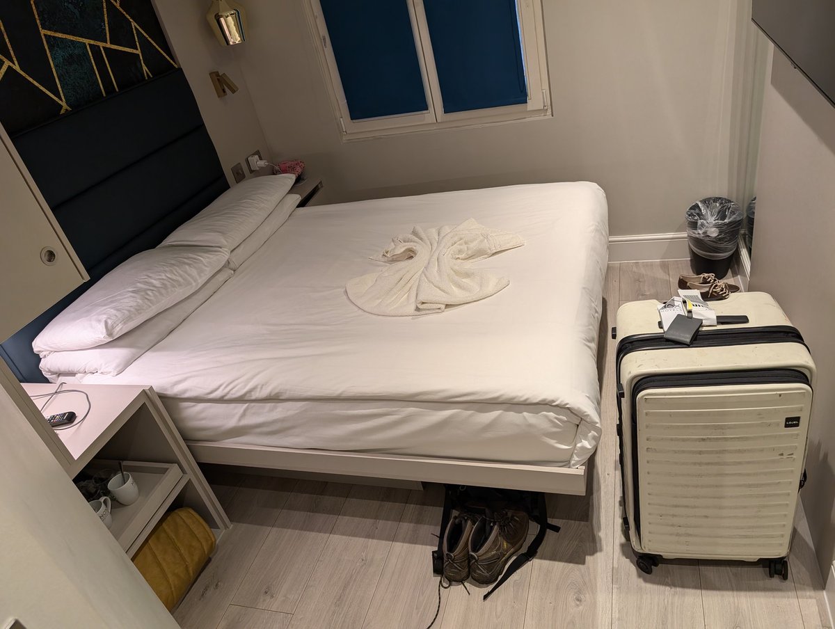 Pictures of the room, hallway and bathroom with a preview of my onlyfeet for scale in terms of the actual size of the shower... To be honest it's only really the bed and pillows that really get to me, the size and worst-in-class soundproofing are much easier to ignore and forgive