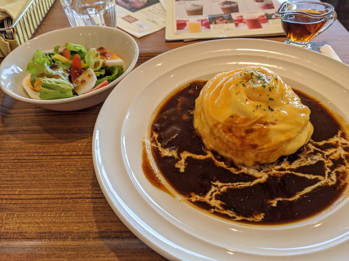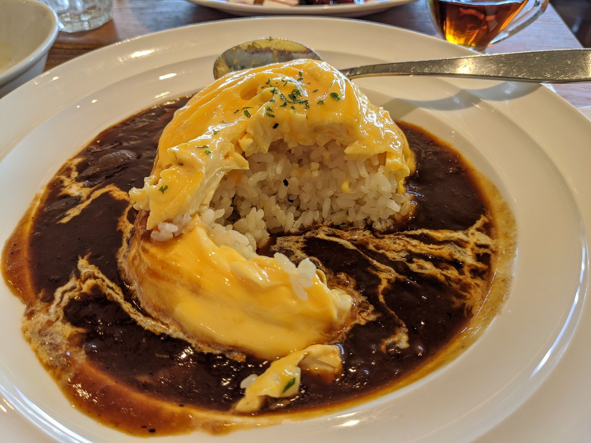 Oh it's fast, we should be good, here's the omurice, it's with a beef stew sauce, pretty tasty