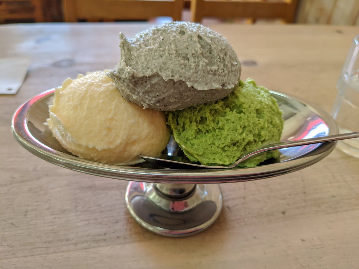 Went to this ice cream place o was recommended and got the three flavor pack, matcha, black sesame and egg, black sesame is my weakness as it's always been, also tried the "lemon squash" which seems to be a lemon soda since I saw a lot of places here offering it