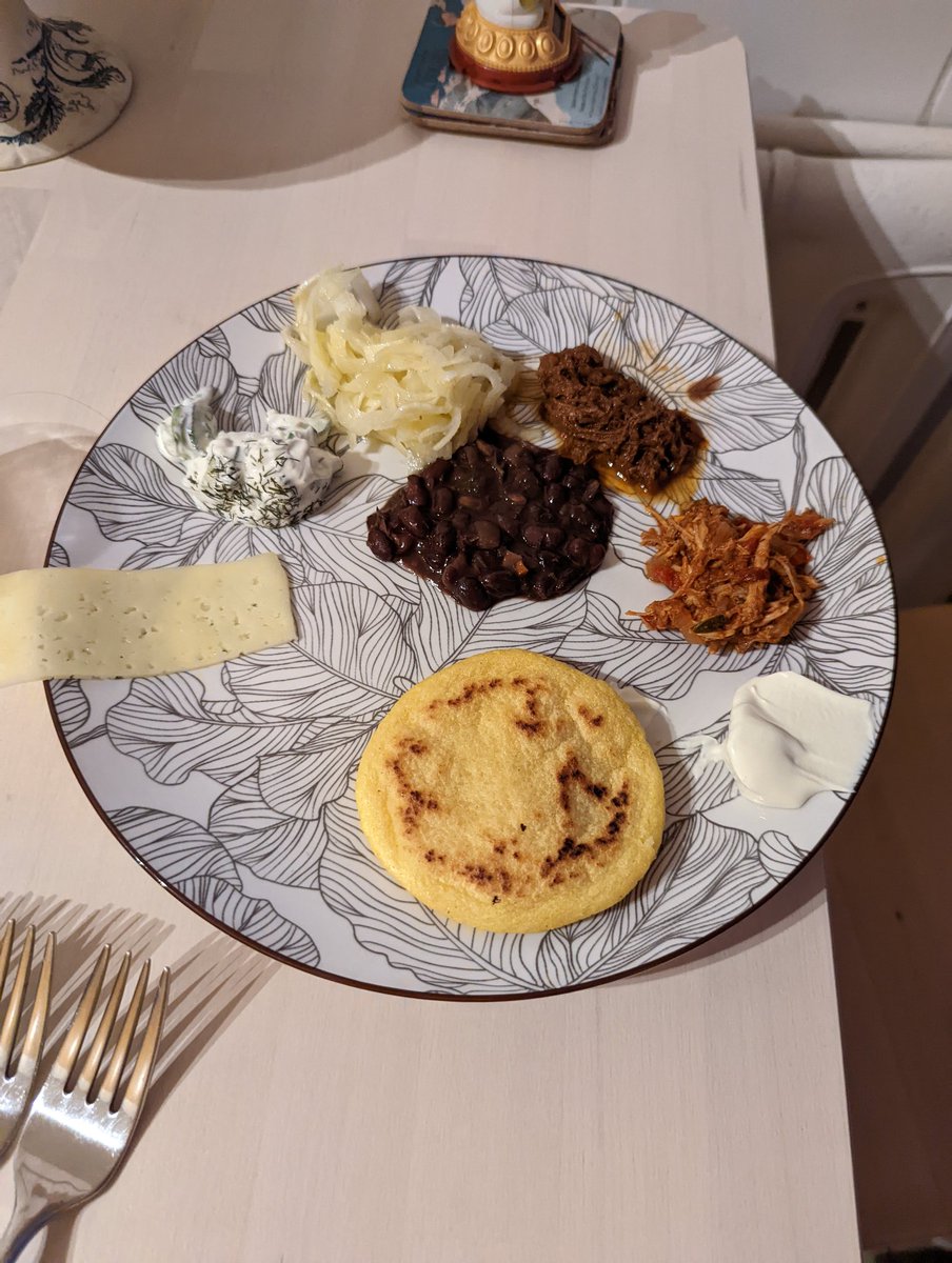 Said arepas with some tzatziki the neighborhour sent up on the elevator, fennel salad then the more traditional cheese, carne mechada and pollo mechado with black beans