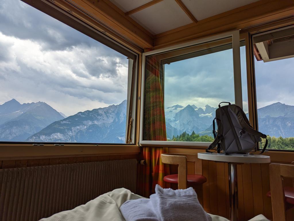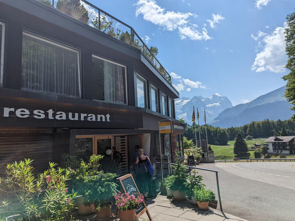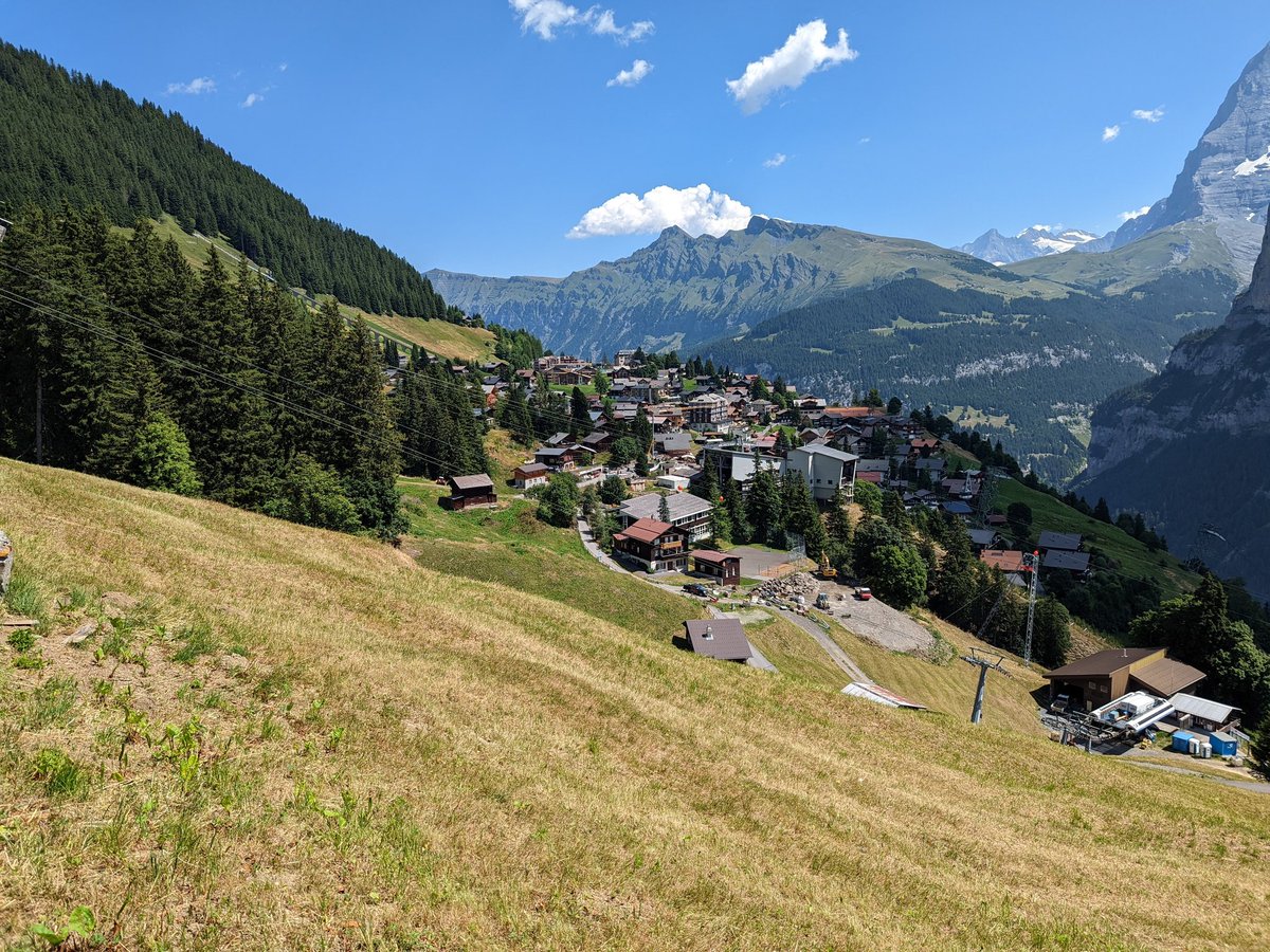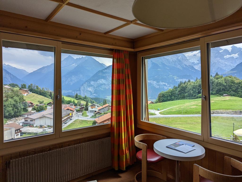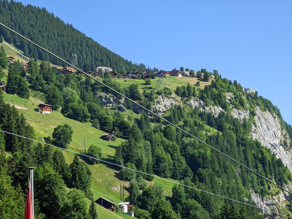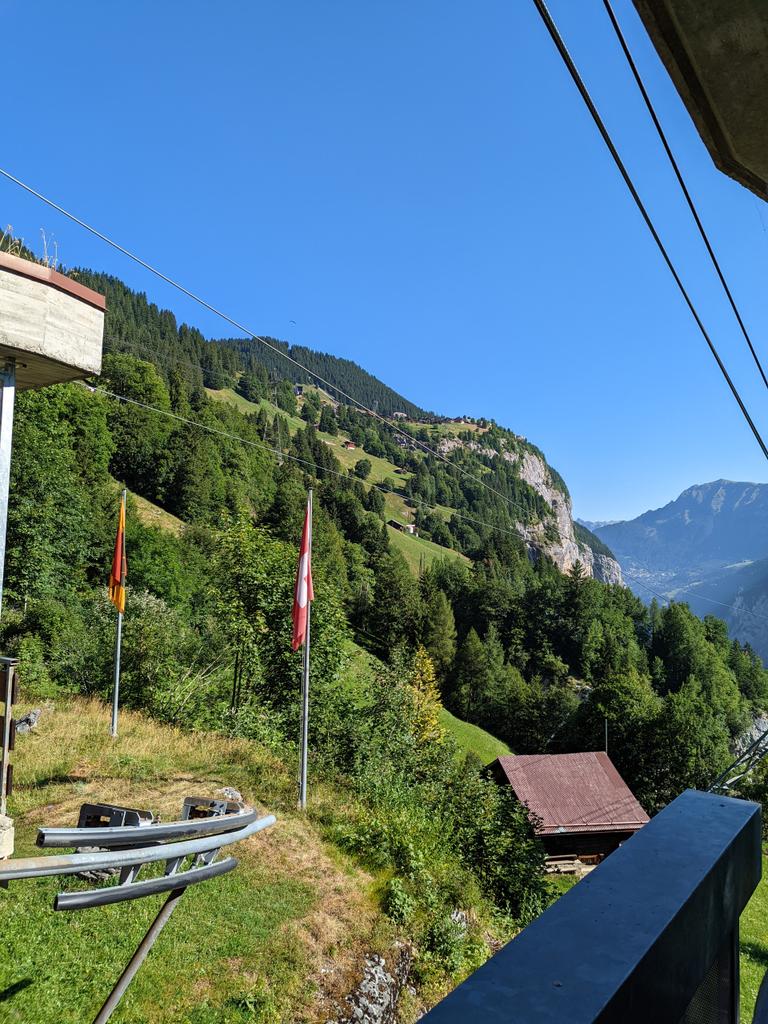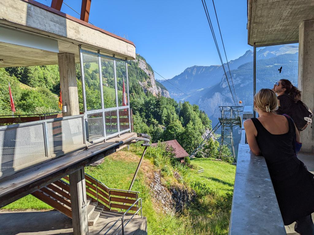 Same breakfast spread then packing up, then waiting for the cable car to drop our bags at the car before some other stuff around here before the drive to the gorge, waiting at the cable car here, second/third pic shows Mürren in the distance