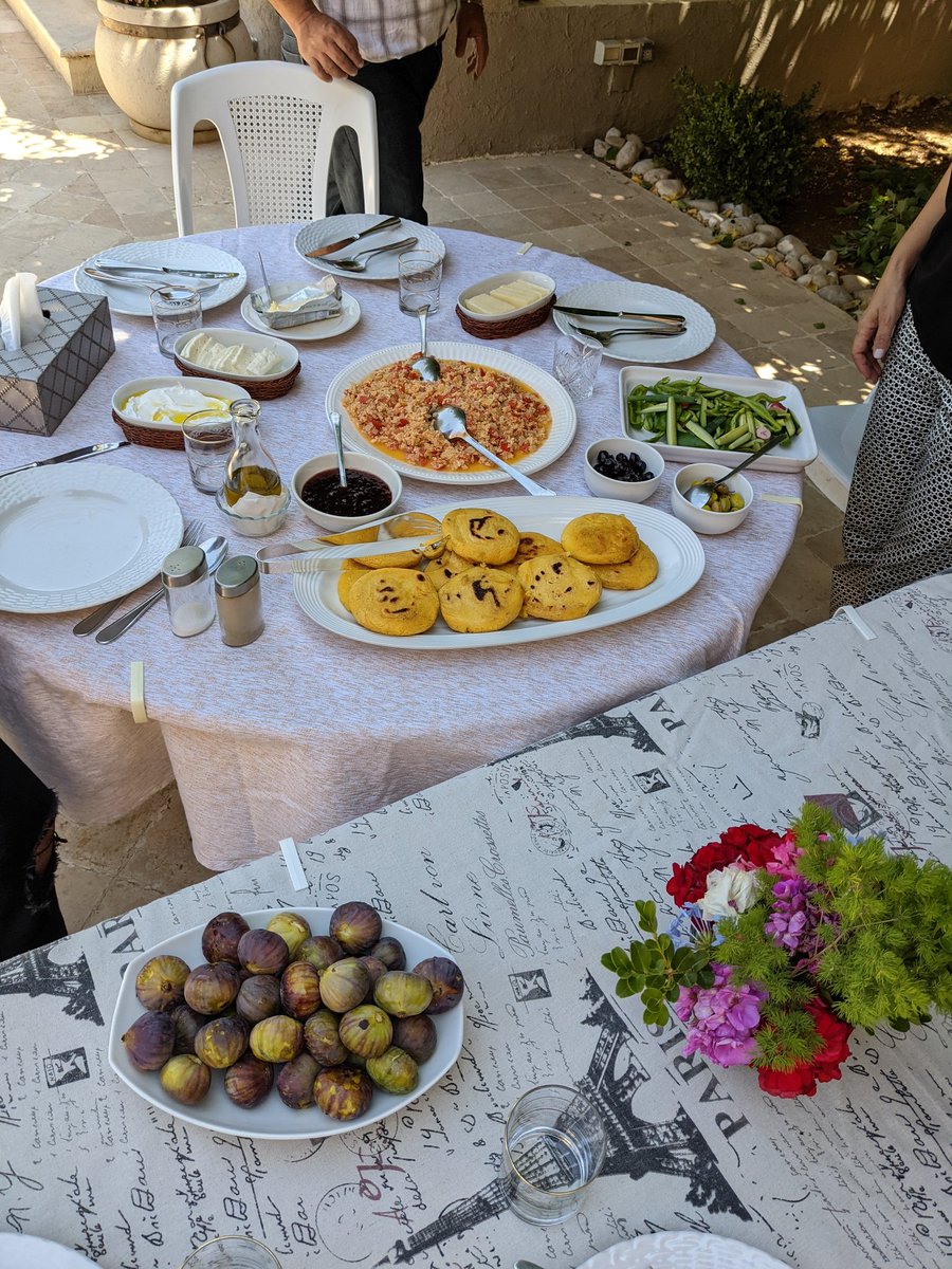 So I spent some time making it because I'm not used to making food for 9 people and didn't know their stove that well. I made them with some perico which is a tomato/onion scrambled egg dish. This was accompanied by more local toppings like labaneh and local cheeses.